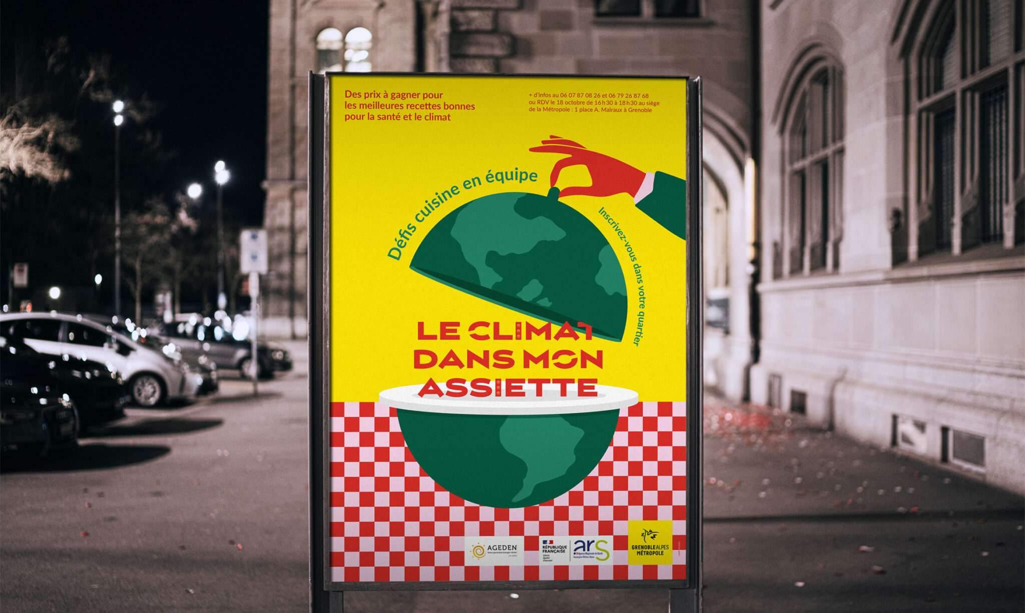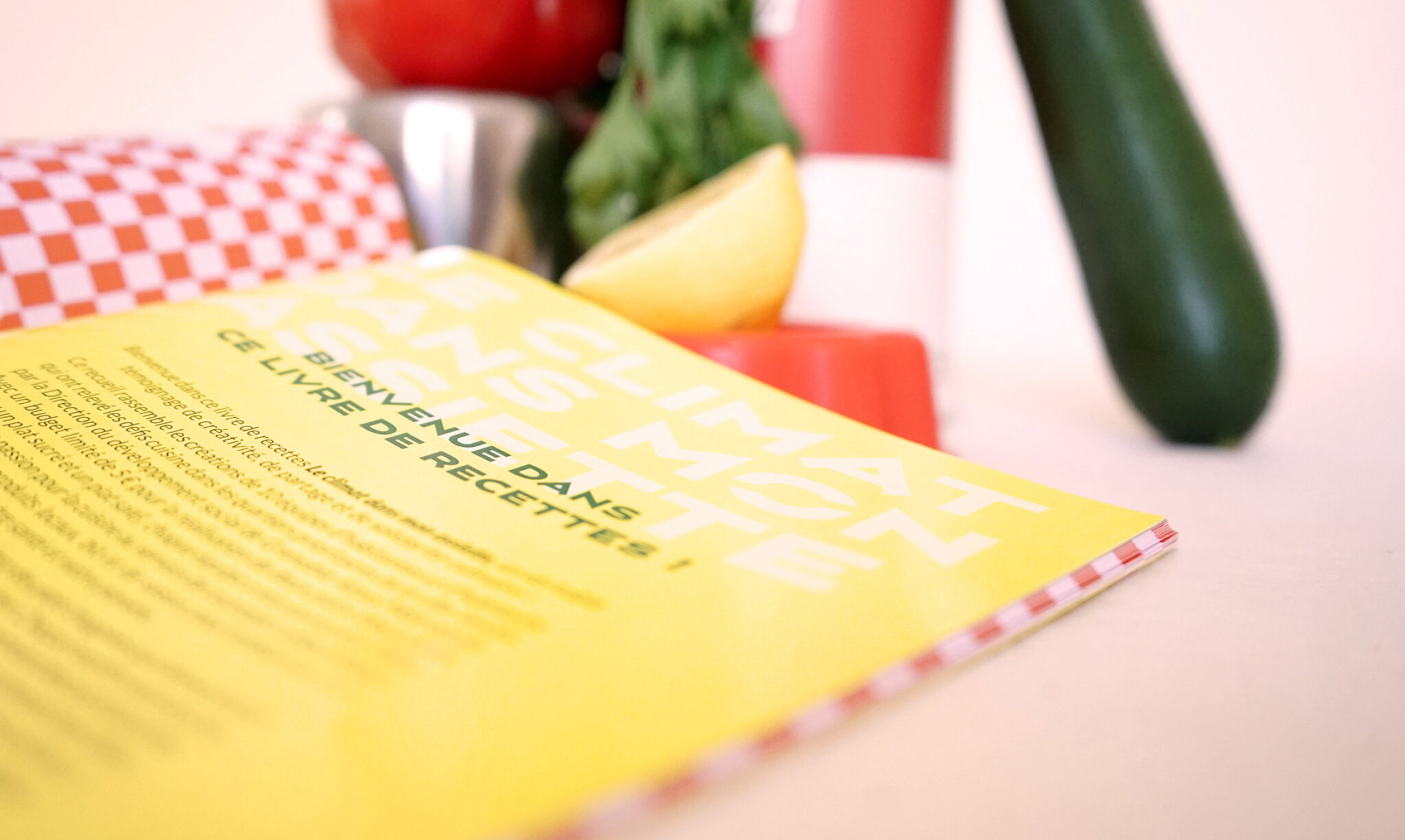 Nous avons créé l’identité visuelle du projet et ses outils de communication. L’affiche pour promouvoir l’événement sur toute l’agglomération grenobloise et le livre de recettes, offert à tous les participants. Chaque équipe a réalisé deux plats ayant le plus faible impact environnemental possible avec un budget maximum de 5€ par personne. Le tout, en privilégiant des produits locaux et de saison commandés auprès des épiceries partenaires. Plusieurs récompenses ont été décernées par le jury : Meilleure recette santé-environnement/ Prix de la créativité et de l’originalité / Prix coup de cœur.