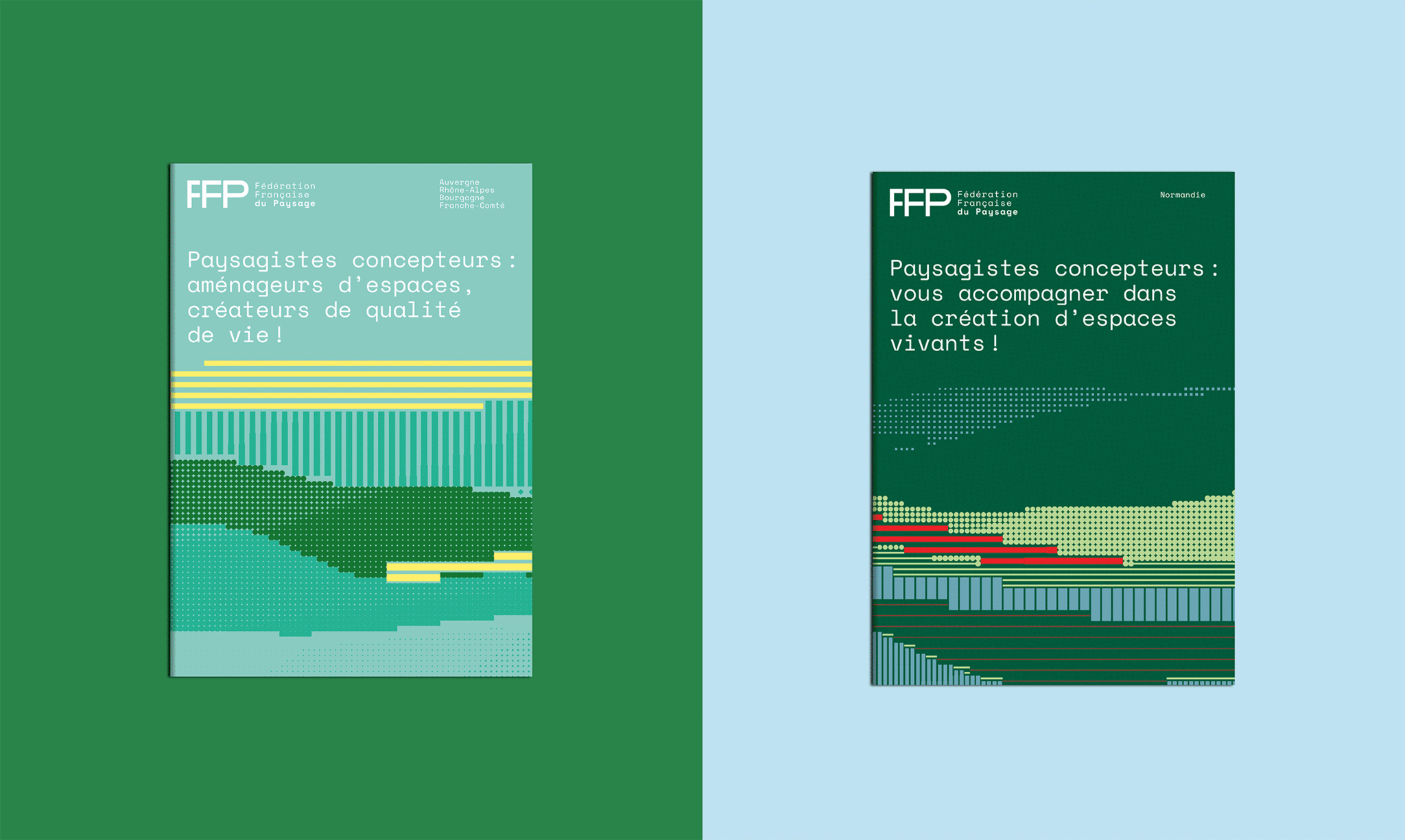 L’identité visuelle, imaginée par l’agence Chevalvert, repose sur un outil génératif sur mesure capable de composer des paysages graphiques. Ces compositions évoquent à la fois la sensibilité des territoires et les trames végétales qui structurent le paysage. Nous avons collaboré avec les 11 délégations régionales de la FFP pour concevoir leur livret de présentation et leur annuaire local. Ainsi, ces éditions permettent de fédérer les paysagistes, promouvoir un métier d’avenir et faire de la FFP une véritable ambassadrice de la profession.